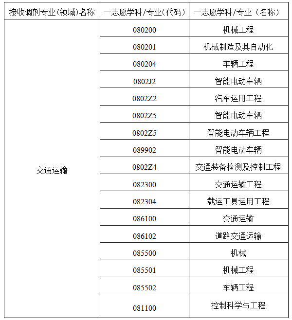 (四)第一志愿初试科目与调入专业初试科目相同或相近,其中初试全国统一命题科目应与调入专业全国统一命题科目相同;初试专业科目为理论力学、汽车构造、汽车理论、材料力学、机械设计、机械原理、交通运输工程系统分析、交通运输工程学、自动控制原理、控制工程基础、数据结构与算法、控制综合基础等相近相关科目。